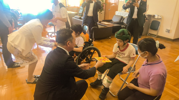 ライオンズクラブの皆様から、温かいメッセージをいただいた後は、さっそく、面白そうな絵本を手渡していただきました。むむむむ、どんな本かな?興味津々で、とっても気になりますね。本校でも人気の、絵本作家の作品を選んでありますので、ぜひ、みなさんで楽しんでくださいね。