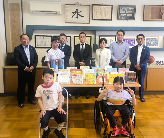 最後に、展示板や机に並べた寄贈本と、記念撮影を、パシャリ!ライオンズクラブの皆様、貴重な図書を寄贈してくださり、誠にありがとうござました。いただいた図書は、館内【新刊コーナー】と、【あおぞら図書館】に配架する予定です。たくさんの児童生徒が、何度も、利用できるように工夫を凝らしていきます。児童生徒のみなさんも、どんどん利用してくださいね!