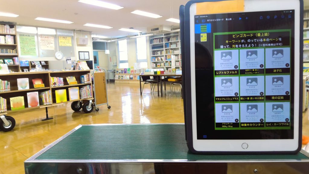 最後に、【iPadを使ったビンゴゲーム】の紹介です。こちらは、カード内に示されたキーワードが掲載されている本のページを写真で撮影して、ビンゴの列を揃えるゲームです。初級から最上級カードの4枚を用意しています。下の画像が最上級カードです。フフフ、皆さんは、いくつのキーワードを御存じでしょうか?こちらのキーワードを含む本も、全て手の届きやすい本棚に置いてありますので、ぜひぜひ探し出してみてくださいね!現在は中学部の生徒が、眉間にしわを寄せながら、館内の本を捜索中です。